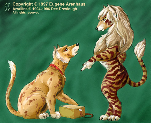 Arrallins are copyright 1994-1996 to Dee Dreslough, published by permission. To see Dee's images of Arrallins and other sentients, the Dimar, go here. These canine sentients live in hivelike families, which consist of breeding alphas and working betas. In the picture, a striped and maned alpha Arrallin instructs a spotty Arrallakeeni beta. Computer painting based on ink drawing. |