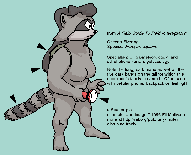- Facts about Cheena Fivering (raccoon), weirdness investigator.