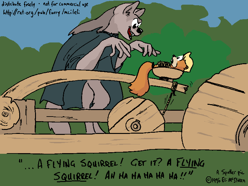 - Villainous wolf prepares to send a hapless squirrel into orbit.
